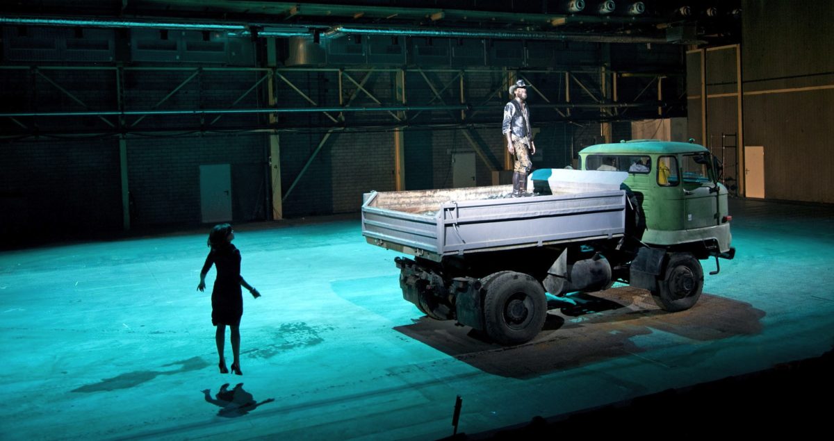 Selbstgewähltes Schicksal, dem Bachmann noch weniger entgeht. Er beantwortet die Schwierigkeit der 30-Meter-Bühne mit dem schlichten Gedanken, den Raum als das zu nehmen, was er ist bzw. war: eine Werkshalle. Aber in einem Industrieraum Arbeit zu spielen, ist nicht originell; es entsteht keine Reibung und Irritation schaffende Differenz. In Bachmanns Adaption von Any Rands »Der Streik«, seinem Kölner Regie-Einstand, bleibt es bei der Gleichung. Das Roman-Pamphlet aus dem antikommunistischen Geist der 50er Jahre benutzt einen amerikanischen Gründer-Mythos, den Eisenbahnbau, als Vehikel für eine politische Utopie. Die Eroberung des Landes, seiner Ökonomie und sozialen Verfasstheit erfolgt durch eine stahlharte Frau, Dagny Taggart, ihre Eisenmänner und einem Ölprinzen, die als Atlas die Welt tragen und sich gegen Staatswirtschaft und Bevormundung, Gewerkschaften, das Gemeinwohl und falsche Gefühlsregungen stemmen. Bachmann arrangiert anfangs eine Gesellschaftsaufstellung und isoliert die Figuren in Lichtkreisen, lässt dann einen Laster ins Depot rollen, das Ensemble Geröll schüppen, Bohlen und Schwellen verlegen, Thesen und Theorien vortragen und macht zur Abwechslung etwas Hollywood-Wind. Die Figuren sind 100 Prozent holzfreies und blutleeres Papier und die in neutraler Debatten-Kultur ausgebreiteten Positionen zwischen Profit-maximierung und Wohlfahrt von schematischer Banalität. Energieverschwendung.