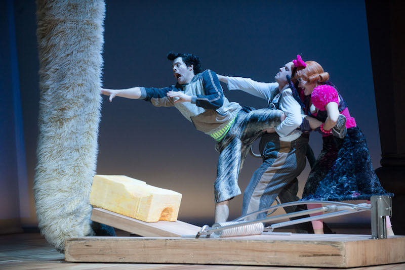 Wir sind nicht bei Hempels unterm Sofa, sondern bei Hoffmanns. Die Sprungfedern sind aus dem Polster getreten und lassen für die Bequemlichkeit des Möbels nichts Gutes ahnen, dessen Unterseite monumental die Bühne des Grillo-Theaters beherrscht, flankiert von vier hölzern gedrechselten Beinen. Stark vergrößert und auf Mäuse-Maßstab gebracht, wo dann Bleistift und Korken ziemlich massig wirken. Hier trainiert die Maus mit Wattestäbchen oder einer Sicherheitsnadel.
