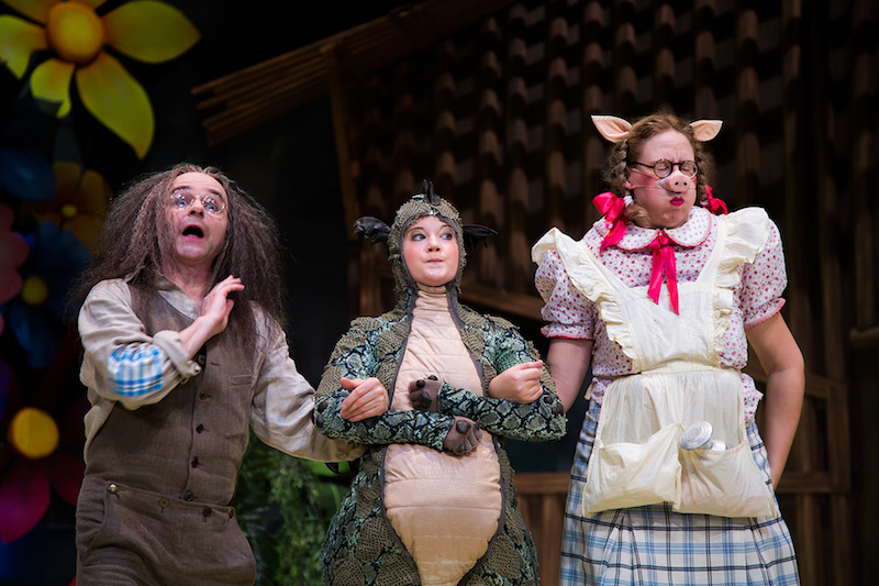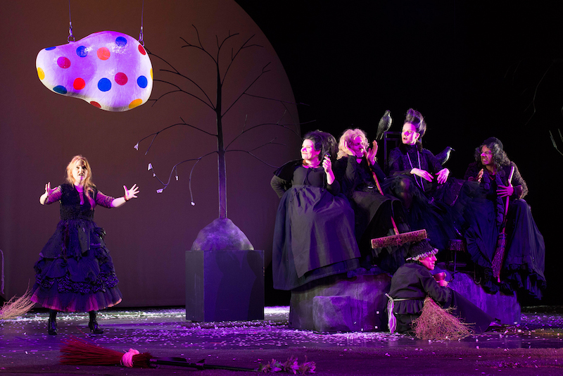 Zugegeben, beim Regen-Hexen hat sie noch ihre Probleme – da klatschen auch schon mal ein paar weiße Mäuse auf den Bühnenboden. Ansonsten klappt es aber schon ziemlich gut mit der Zauberei. Muss es auch. Schließlich hat die kleine Hexe monatelang gebüffelt, Tag für Tag sieben Stunden das Hexenbuch durchgeackert. Auch sonst alles daran gesetzt, eine richtig »gute« Hexe zu werden, um künftig trotz ihres jugendlichen Alters von nur 127 Jahren beim Tanz auf dem Blocksberg dabei sein zu dürfen. Nun naht die Prüfung vor dem Hexenrat. Die Ärmste ist fertig mit den Nerven. An diesem Punkt steigt die Inszenierung mitten in Ottfried Preußlers Kinderbuchklassiker ein und lässt die »guten« Hexentaten des verstrichenen Jahres im Rückblick gerafft vorüberziehen. Gemeinsam mit ihrem treuen Raben-Kumpel Abraxas erinnert sich die kleine Hexe an die Läuterung des unbarmherzigen Revierförsters und die Rettung eines Ochsen vor dem Grill. Man sieht zu, wie sie den Schneemann zur Züchtigung von zwei bösen Buben animiert und die Papierblumen eines bettelarmen Mädchens mit unwiderstehlichem Duft bezaubert.