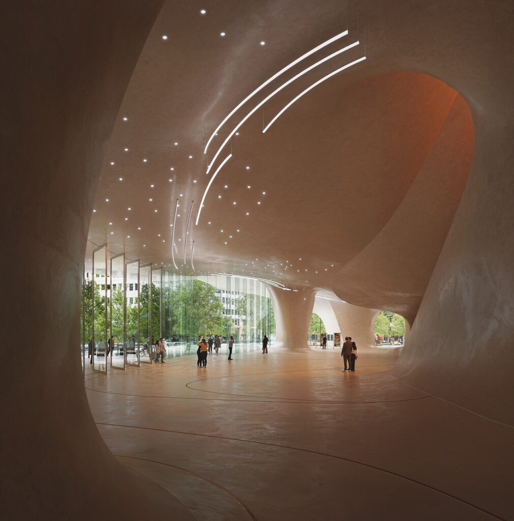 Einst hatte der Konsum das Stadtbild geprägt. »Aber die Innenstädte werden weiter das Problem haben, dass Geschäfte nicht mehr so belegt sind, weil die Menschen immer mehr online kaufen«, sagt Alexandra Stampler-Brown. Das gemeinschaftliche Erlebnis, ob beim Einkaufsbummel oder beim Kaffeetrinken, würden sie jedoch nach wie vor suchen. Das »Opernhaus der Zukunft« solle daher ein Ort des Miteinanders werden – mit all seinen Möglichkeiten: Die Schadowstraße mit ihren Geschäften links und rechts würde künftig in einem »qualitativ hochwertigen Ort« münden. Denn das neue Konzert- und Bühnenhaus ist als »Dritter Ort« gedacht, in dem sich die Besucher*innen ohne Konsumzwang einfach aufhalten können: mit großen Dachterrassen in alle Richtungen und einem durchlässigen Erdgeschoss, das eine große Fläche bietet, die aber in ihrer organischen Form ebenso Geborgenheit vermitteln will.
