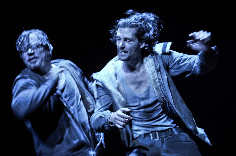 Es gibt nur einen Ausweg. Er führt in die Tiefe, durch eine Luke im Erdboden, als ginge es in die Kanalisation, die wir nicht Hölle nennen wollen. Weil es auch so recht keinen Himmel und schon gar keinen Gott gibt. Der ist, bei Raiko Küster, ein Beckett-Rest, verlottert, schäbig, im Bademantel und mit Zottelhaar unter der Mütze: ein Fall für die Geriatrie. Und seine Bibel, aus der er die Genesis vorträgt, eine staubige Schwarte. Beckmann, der Kriegsheimkehrer in Gestalt seines anderen, aktivischen Ichs, wird noch die Asche einer Zigarette (es wird in den knapp zwei Stunden viel geraucht) auf der Heiligen Schrift abschnippen und auf das Buch spucken. David Bösch lässt keinen Zweifel, was es auf sich hat mit Wolfgang Borcherts »Draußen vor der Tür«, und erklärt in perfekt herausgeputztem Schmutz und Elend aller kulturell überlieferten Sinnproduktion den Krieg. Gott und das Übrige werden verklappt. Doch mit seinem traurigen Kinderblick, den neo-expressionistischen Bildelementen, mit falschem Beinstumpf, Totenkopfmaske, La Paloma und dem Trio eines Buddy-Movie samt Nikotinkippen hält er sich auch das – durchaus imponierend angeeignete, bildmächtig wüst aufgerüstete – Drama vom Leibe.