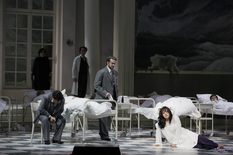 Johannes Leiacker hat den Saal eines feudalen Lungensanatoriums mit Ausblick in eine Hochgebirgslandschaft auf die Bühne gestellt. In einem der Krankenhausbetten des »Zauberbergs« liegt die Titelheldin und betrachtet sich im Spiegel. Regisseur Josef Ernst Köpplinger verlegt die Geschichte in das Paris der späten 1920er Jahre und lässt die Handlung in der Rückschau ablaufen. Die Klink wird während der vier Akte nie verlassen. Mit flitternden Charleston-Kostümen sorgen Choristen und Statisten für die Party-Kulisse der Ballszenen, im Kontrast dazu steht das intime Kammerspiel, das sich in den räumlichen Weiten etwas verliert.