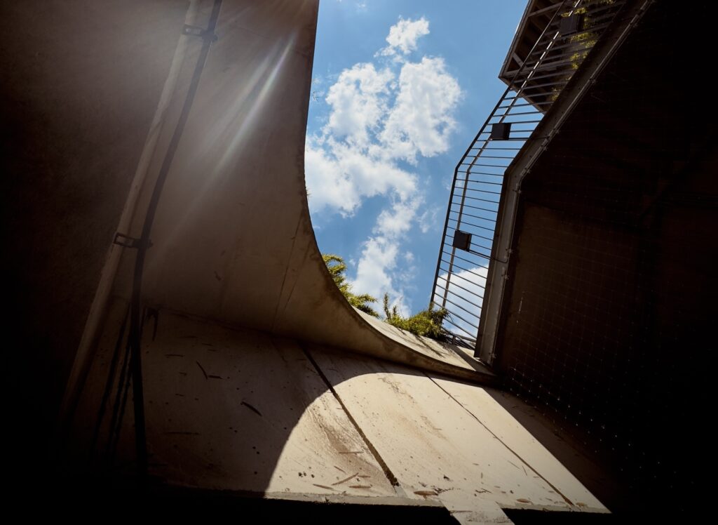 Diese ausgefeilte Architektur ist Ergebnis langer Arbeit. Sieben Jahre lang hätten die Bauarbeiten gedauert, erzählt Riedel. Grund dafür waren auch die massiven Bunkerwände. Der Bunker musste aufgeschnitten und durchgebrochen werden. Steht man im Hinterhof, dem Raucherbereich des Clubs, kann man von hier aus in den Himmel schauen. 100 Klötze wurden dafür aus der Decke herausgesägt.