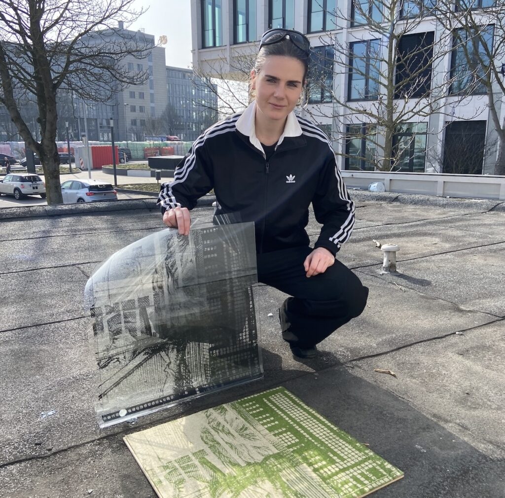 Mit ihrem umfassenden Interesse griff Burger für ihren Auftritt in der aktuellen Ausstellung auf Schloss Morsbroich ein altes Druckverfahren auf: die Anthotypie. Farbe aus Pflanzensaft sorgt dafür, dass das Bild im Museum, von UV-Licht beschienen, nach und nach verschwindet. Wie das funktioniert? Sie kann es zeigen und führt auf ein Dach vor dem Atelierfenster, wo zwei mit einem Gemisch aus Alkohol und Alge bedruckte Blätter in der warmen Frühlingssonne liegen.